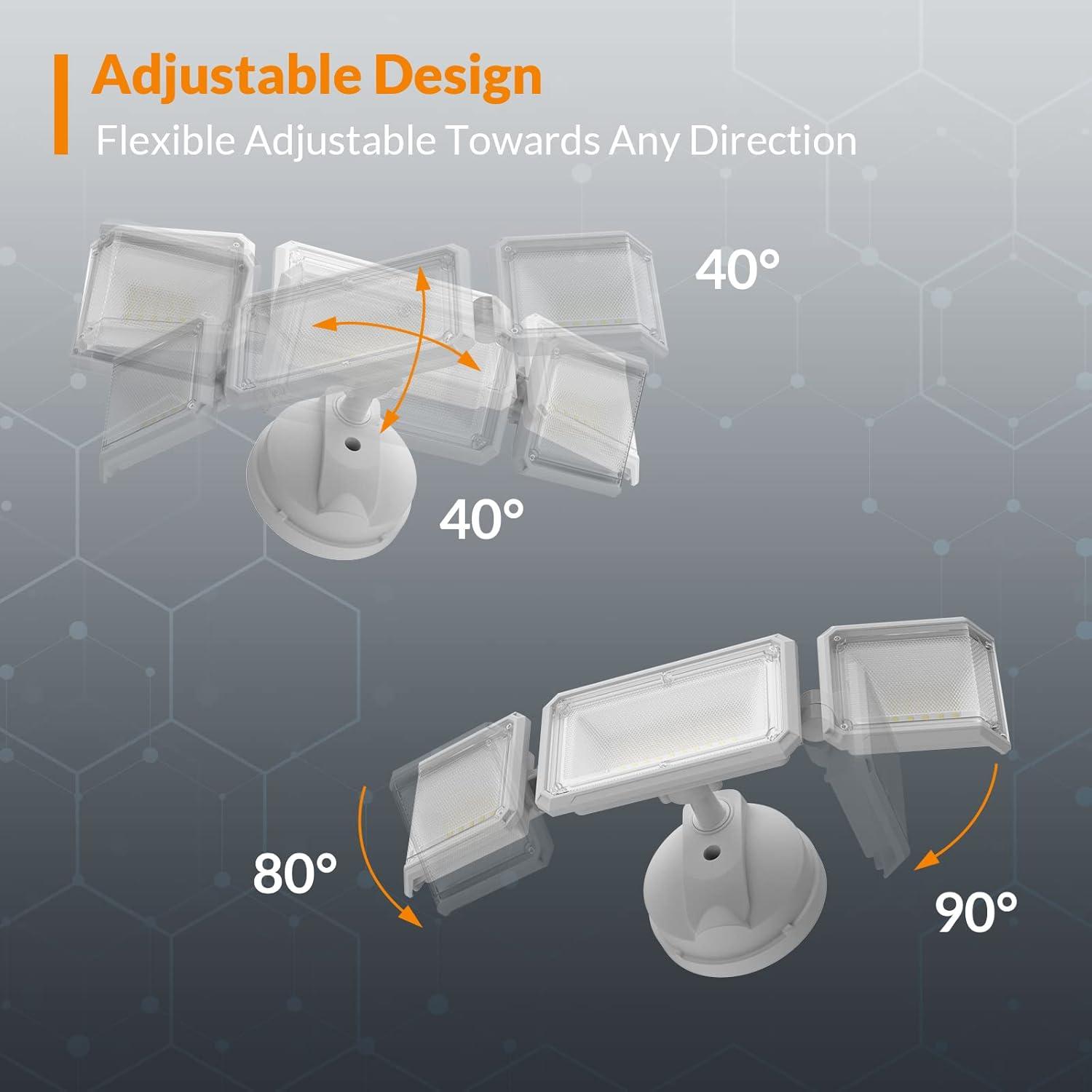 Enduring Aluminum Design & IP65 Waterproof: Cast in die-cast aluminum, the motion light outdoor has good heat dissipation, which is more enduring. The lifespan of flood security light will be up to 50,000 hrs. IP65 waterproof rating can survive frost, rain, snowfall, storm weather, and ensure steady performance