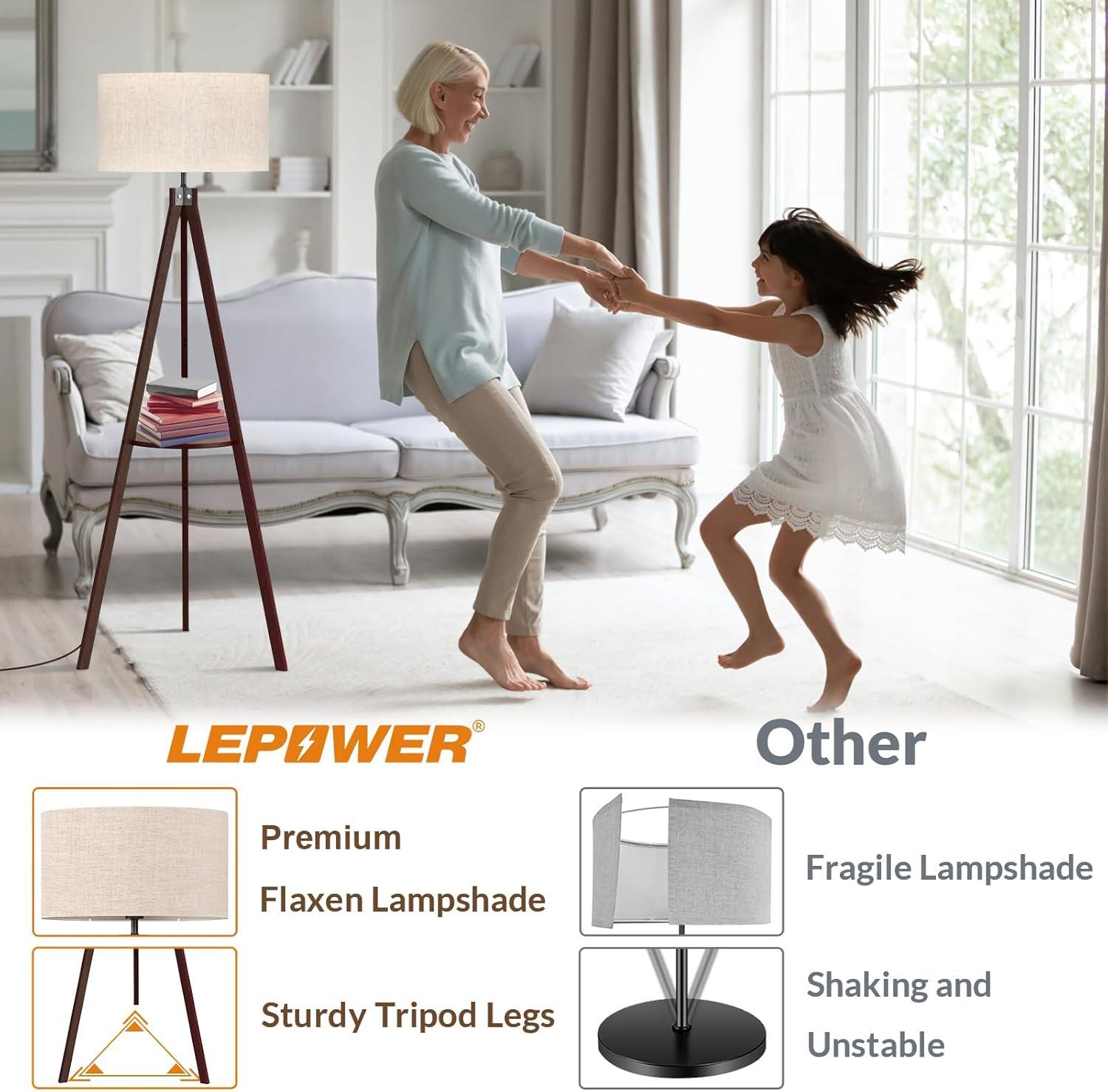 LEPOWER Wood Tripod Floor Lamp, Mid Century Standing Lamp, Modern Design Studying Light for Living Room, Bedroom, Study Room and Office, Flaxen Lamp Shade with E26 Base Dark Brown(Dark Brown Holder)